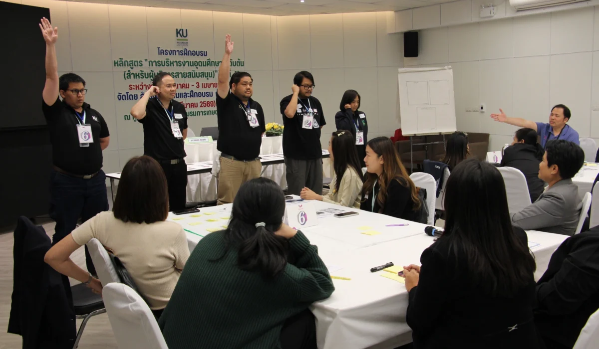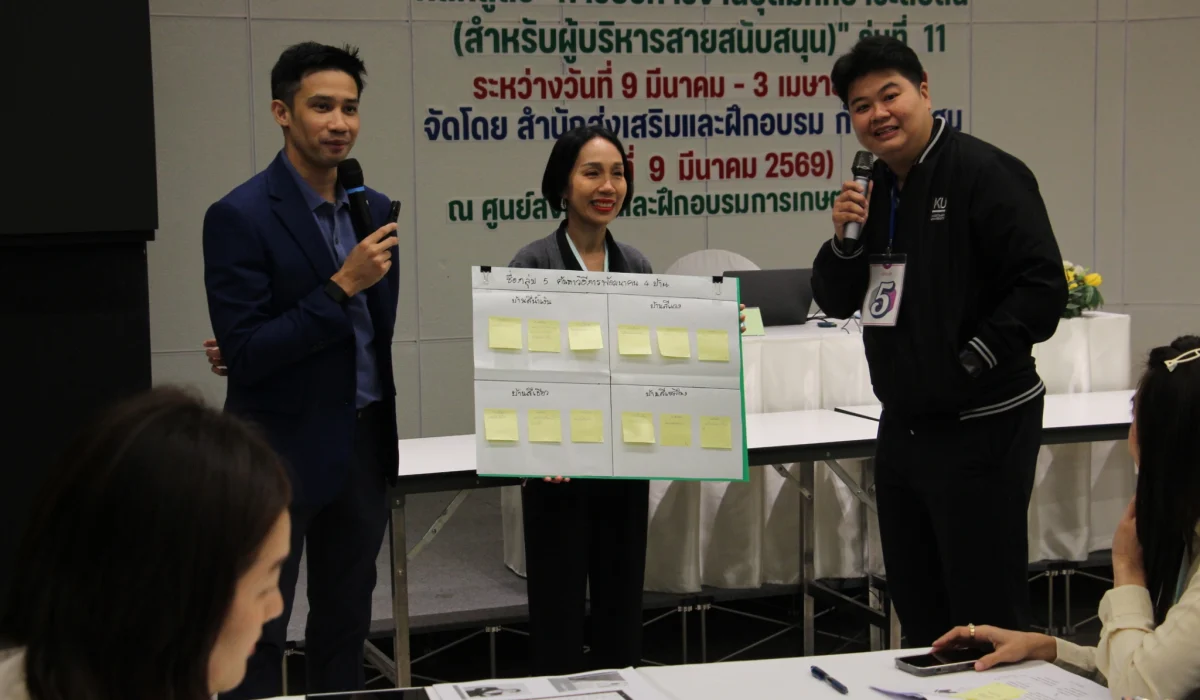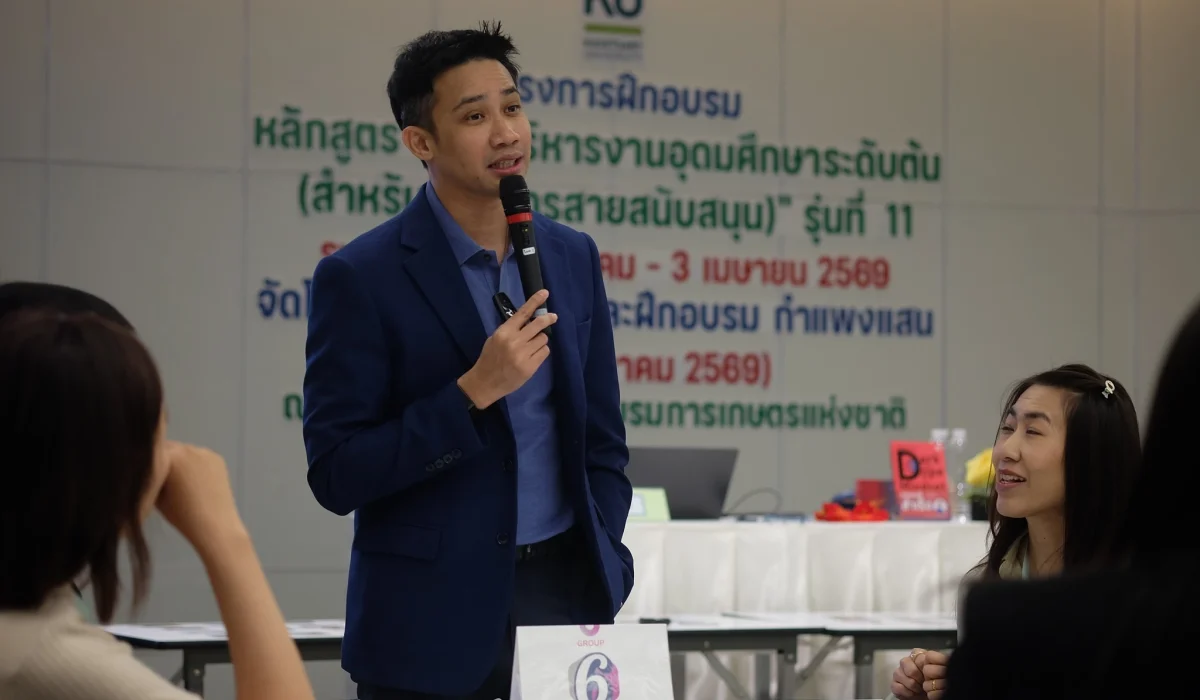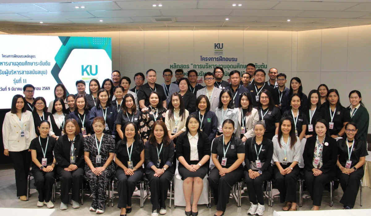 สำนักส่งเสริมและฝึกอบรม กำแพงแสน โดย NExT-Academy จัดฝึกอบรมหลักสูตร “การบริหารงานอุดมศึกษาระดับต้น (สำหรับผู้บริหารสายสนับสนุน)” รุ่นที่ 11 ในรูปแบบไฮบริด (onsite & online) ระหว่างวันที่ 9 มีนาคม – 3 เมษายน 2569 โดยในวันจันทร์ที่ 9 มีนาคม 2569 ดร.กันยารัตน์ เชี่ยวเวช หัวหน้าโครงการฯ ได้ปฐมนิเทศแนะนำหลักสูตร และ ผศ.ดร.ชัชมาศ กาญจนอุดมการ รองผู้อำนวยการสำนักส่งเสริมและฝึกอบรม กำแพงแสน ได้กล่าวต้อนรับผู้เข้ารับการฝึกอบรม และอาจารย์มงคล กรัตะนุตถะ ผู้เชี่ยวชาญด้านการพัฒนาทัศนคติเชิงบวกและการพัฒนาทักษะหัวหน้างาน ให้เกียรติเป็นวิทยากรในกิจกรรม “กลุ่มสัมพันธ์และละลายพฤติกรรม และกิจกรรมสร้างทีมงานและพัฒนาเครือข่าย” สำหรับหลักสูตรนี้มีผู้อบรมจำนวน 51 คน จาก 8 มหาวิทยาลัย ได้แก่ มหาวิทยาลัยเกษตรศาสตร์ มหาวิทยาลัยเทคโนโลยีราชมงคลธัญบุรี มหาวิทยาลัยเทคโนโลยีราชมงคลล้านนา มหาวิทยาลัยนราธิวาสราชนครินทร์ มหาวิทยาลัยนเรศวร มหาวิทยาลัยราชภัฏนครสวรรค์ มหาวิทยาลัยราชภัฏอุดรธานี และมหาวิทยาลัยสงขลานครินทร์
